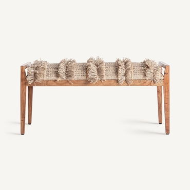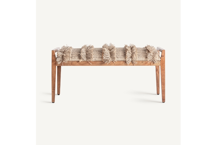 Banco, fabricado en madera de mango en color marrón claro, combinado con algodón en color tonos en marrón y yute en color beige.