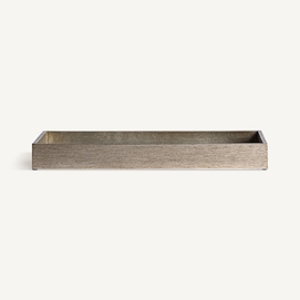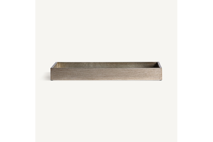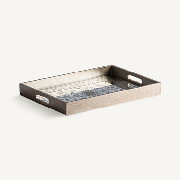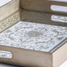 Bandeja rectangular suiss, en color plata/oro viejo, de estilo art deco. Fabricado en madera dm, combinado con espejo.