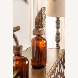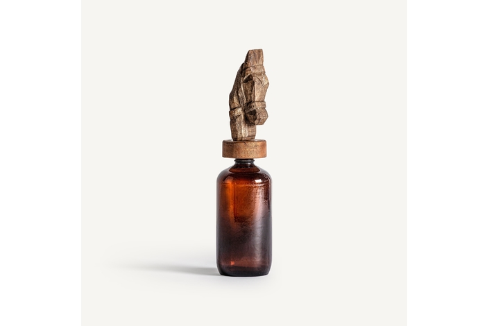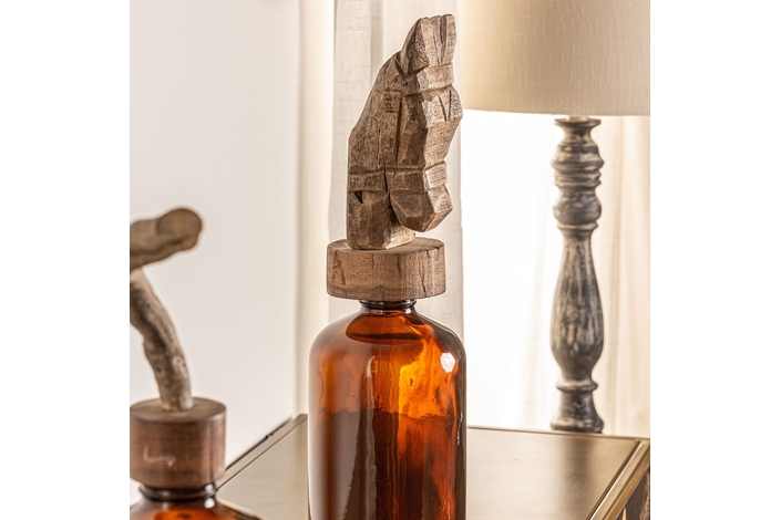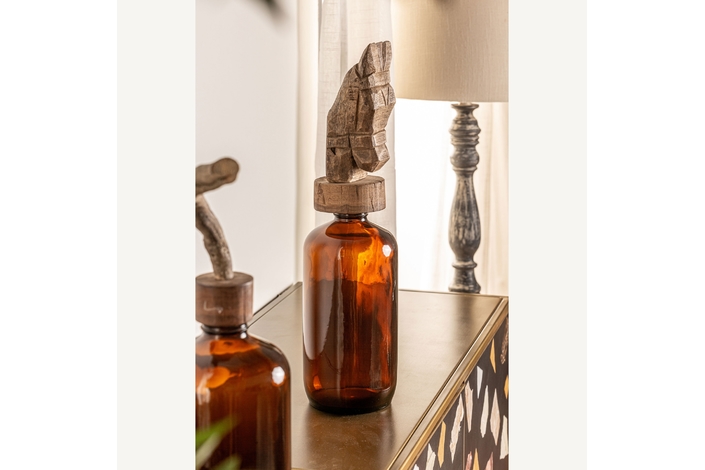 Estas botellas provienen de las antiguas industrias indias. Se ha aprovechado la botella original y se ha colocado un caballo vintage de madera sobre el tapón original. Con ello se logra un producto único e interesante.