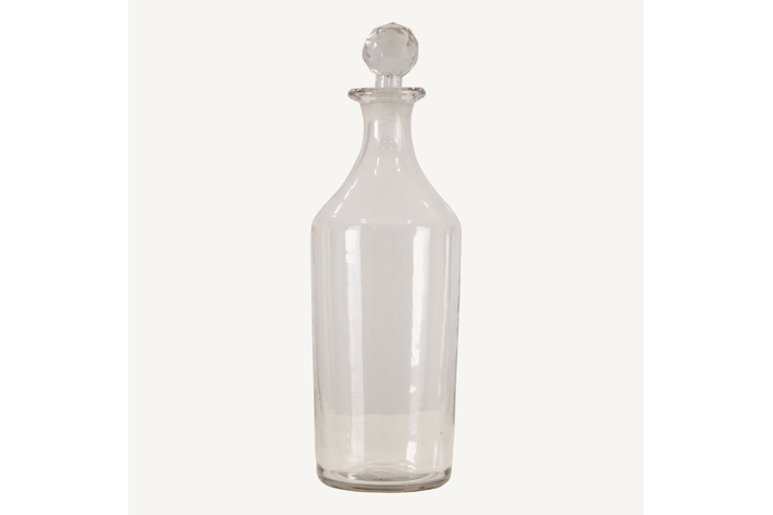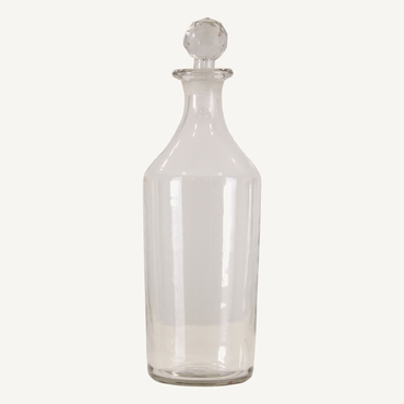 Botella decorativa cilindrica kolb, en color transparente, de estilo art deco. Fabricado en vidrio.