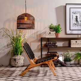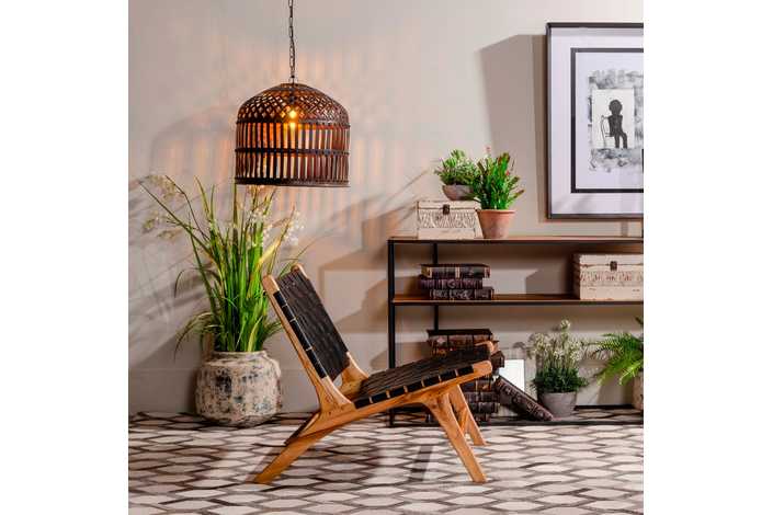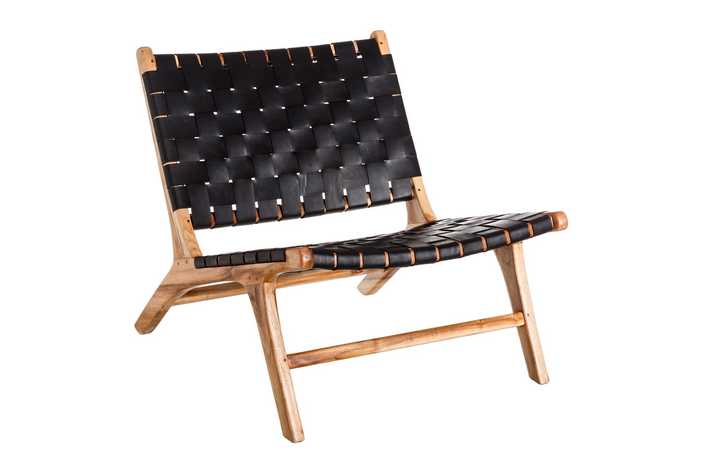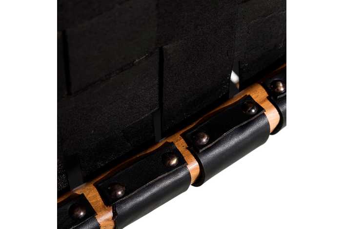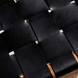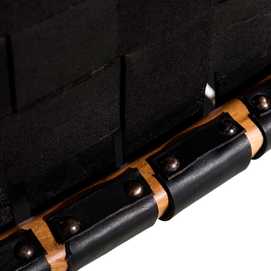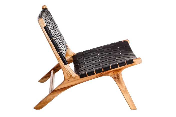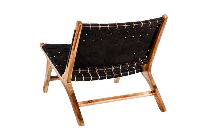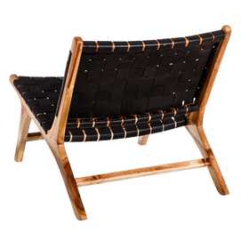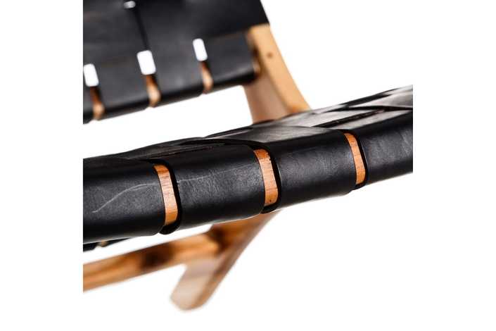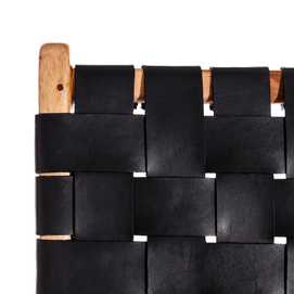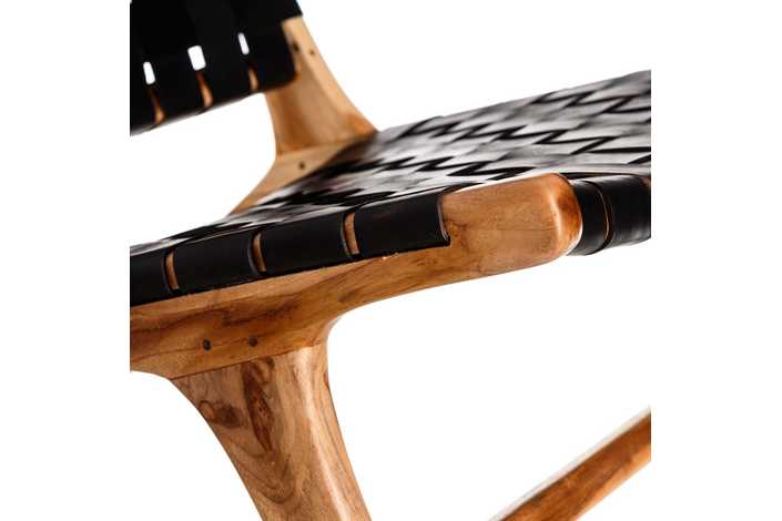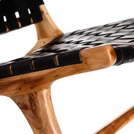MADERA MACIZA DE TEKA ACABADO NATURAL Y PIEL ACABADO NEGRO TRENZADA A MANO.