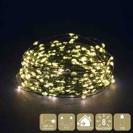 FUNCIONA CON LA RED ELÉCTRICA 1.5W. TRANSFORMADOR CON 8 FUNCIONES. IP44 (USO INTERIOR / EXTERIOR) CABLE DE COLOR VERDE DISTANCIA ENTRE BOMBILLAS: 5 CM. 100 LEDS DE LUZ CÁLIDA EXTENSIÓN DE CABLE: 5 METROS. ESTE PRODUCTO NO TIENE LA FUNCIÓN DE TEMPORIZADOR. PRESENTACIÓN EN CAJA IMPRESA EN COLOR.