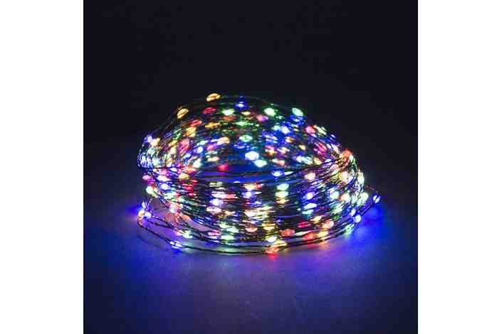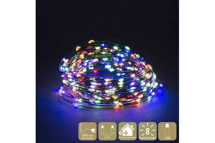 FUNCIONA CON LA RED ELÉCTRICA 1.5W. TRANSFORMADOR CON 8 FUNCIONES. IP44 (USO INTERIOR / EXTERIOR) CABLE DE COLOR VERDE DISTANCIA ENTRE BOMBILLAS: 5 CM. 100 LEDS DE LUZ MULTICOLOR EXTENSIÓN DE CABLE: 5 METROS. ESTE PRODUCTO NO TIENE LA FUNCIÓN DE TEMPORIZADOR. PRESENTACIÓN EN CAJA IMPRESA EN COLOR.