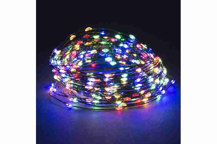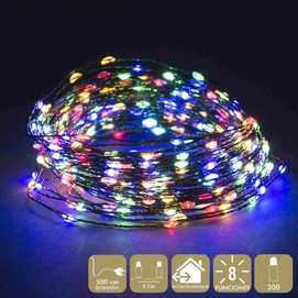 FUNCIONA CON LA RED ELÉCTRICA 6W. TRANSFORMADOR CON 8 FUNCIONES. IP44 (USO INTERIOR / EXTERIOR) CABLE DE COLOR VERDE DISTANCIA ENTRE BOMBILLAS: 5 CM. 300 LEDS DE LUZ MULTICOLOR EXTENSIÓN DE CABLE: 5 METROS. ESTE PRODUCTO NO TIENE LA FUNCIÓN DE TEMPORIZADOR. PRESENTACIÓN EN CAJA IMPRESA EN COLOR.