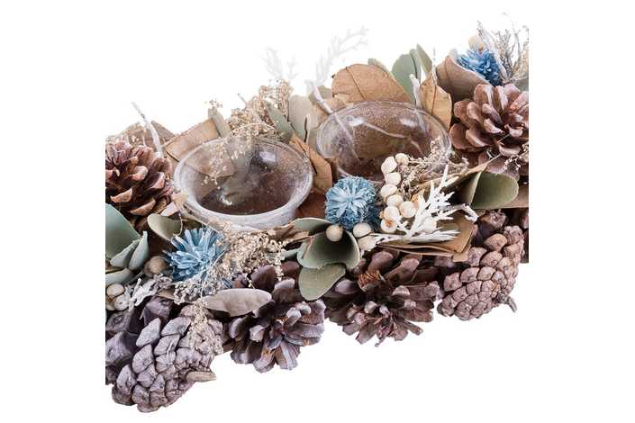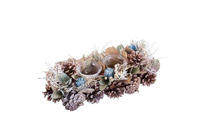 PIÑAS, FLORES Y HOJAS EN TONOS BLANCO/AZUL. TAMAÑO DE CADA PORTAVELAS DE CRISTAL: 6 X 4 X 4,50 CM.