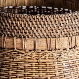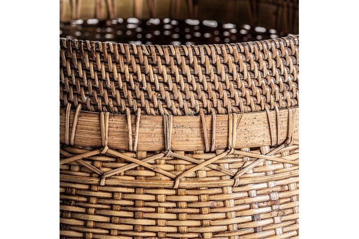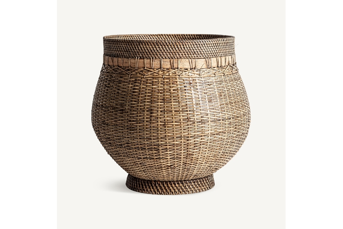 Cesto, en color marrón, de estilo boho. Fabricado en ratán.