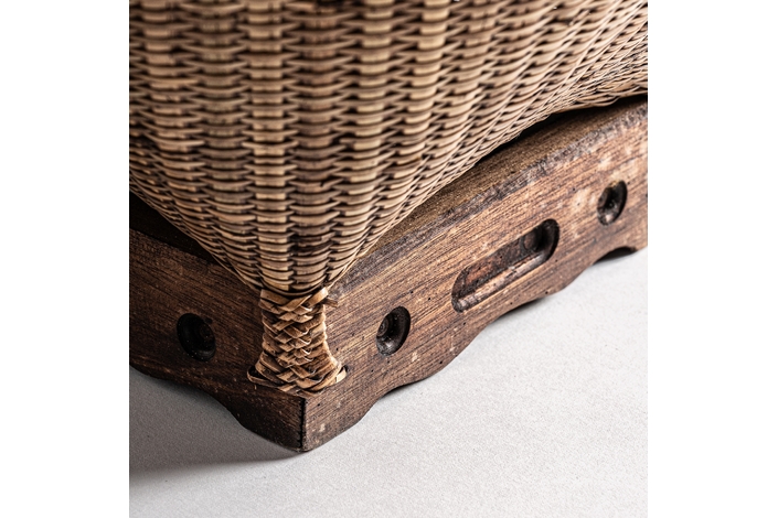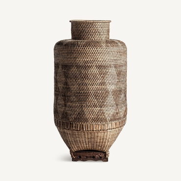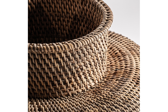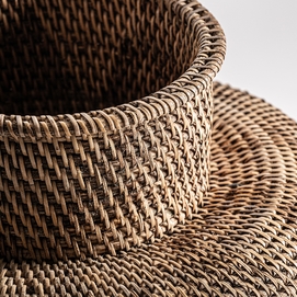 Cesto kalid, en color marrón, de estilo boho. Fabricado en ratán, combinado con madera.