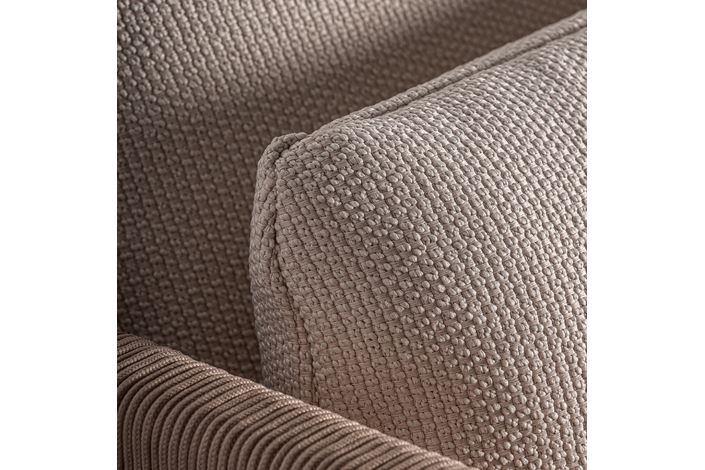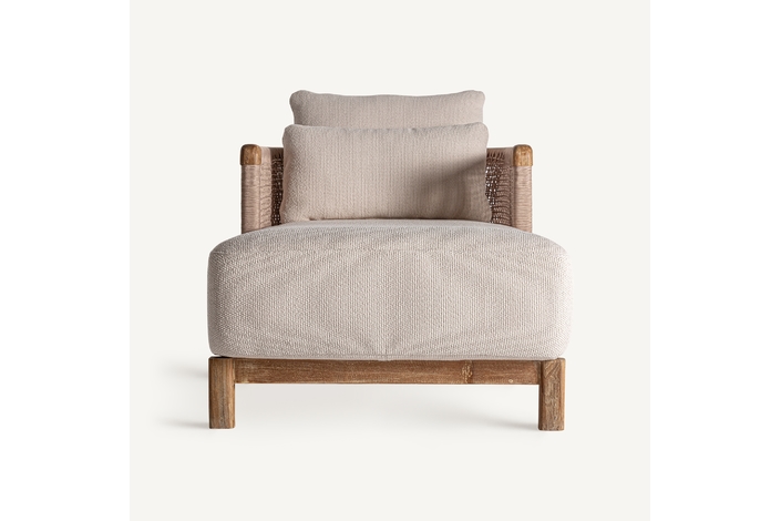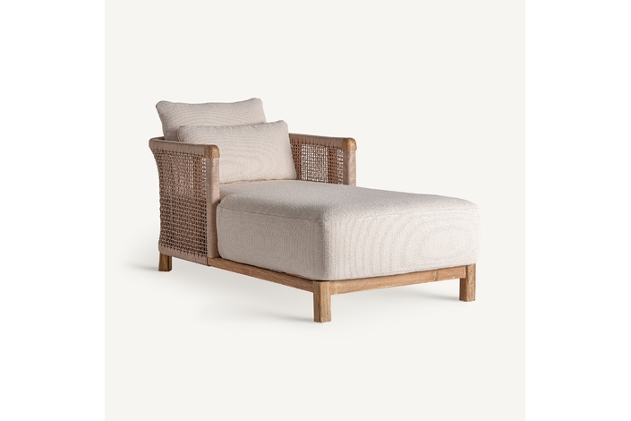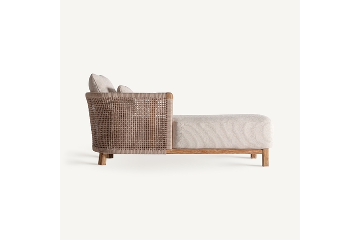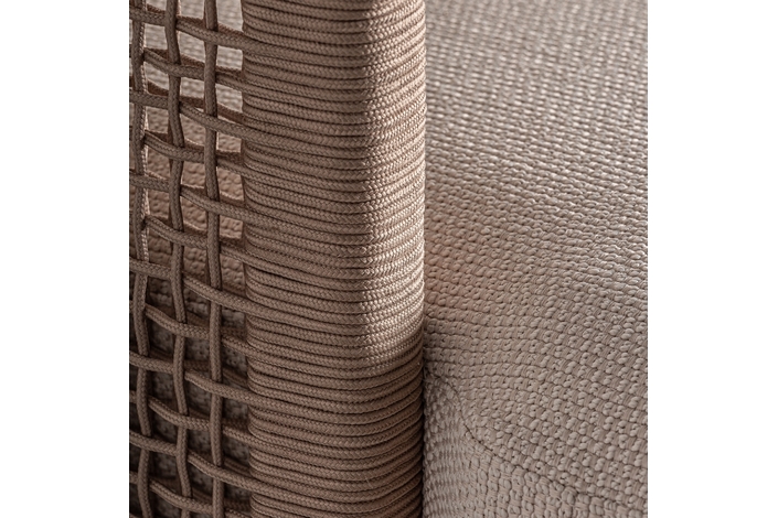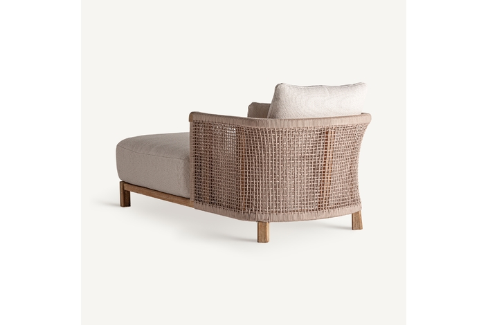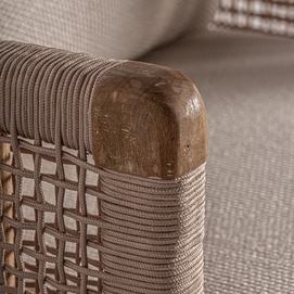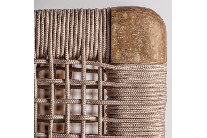 La elegancia de la colección Trena es la suma de dos conceptos: ligereza y contundencia. El respaldo se muestran como una pieza envolvente, que abraza todo el conjunto, creando un espacio íntimo, donde la cuerda es el material protagonista. En el sofá el ratán descansa sobre una tarima de madera de teca reciclada: una estructura que lo sostiene, lo eleva y le aporta una sensación de ingravidez, delicada y sutil.