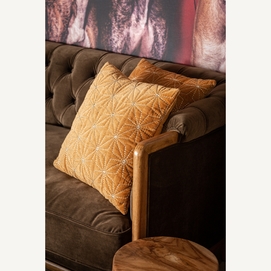 Cojín vilma, en color ocre bordado, de estilo clásico. Fabricado en terciopelo, combinado con algodón y poliéster. Producto desenfundable.
