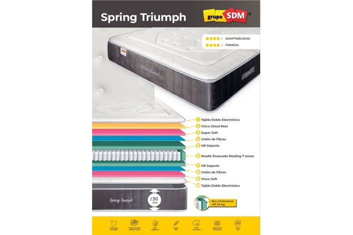 El Colchón Triumph es el colchón de muelles ensacados perfecto para convertir tus sueños en placenteros, silenciosos y reparadores. Triumph incorpora un tejido revolucionario de Iones de plata que contiene unas micropartículas que generan iones negativos para crear una atmósfera relajante.