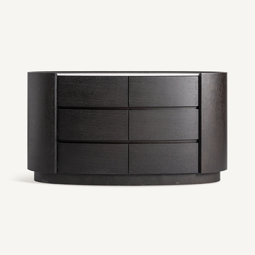 Cómoda Isola de estilo contemporáneo, fabricado en madera contrachapada en color negro, combinado con chapa de roble en color negra y piedra sinterizada en color blanco.