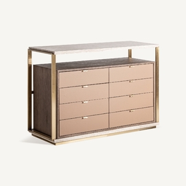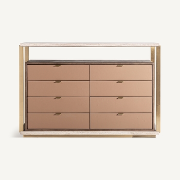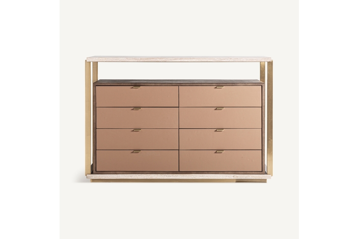 Cómoda monza, de estilo art deco. Fabricado en travertino, en color beige, combinado con acero inoxidable, en color dorado y madera dm, en color marrón.