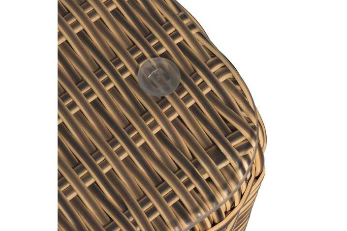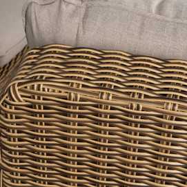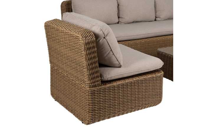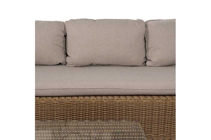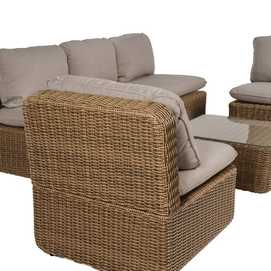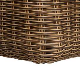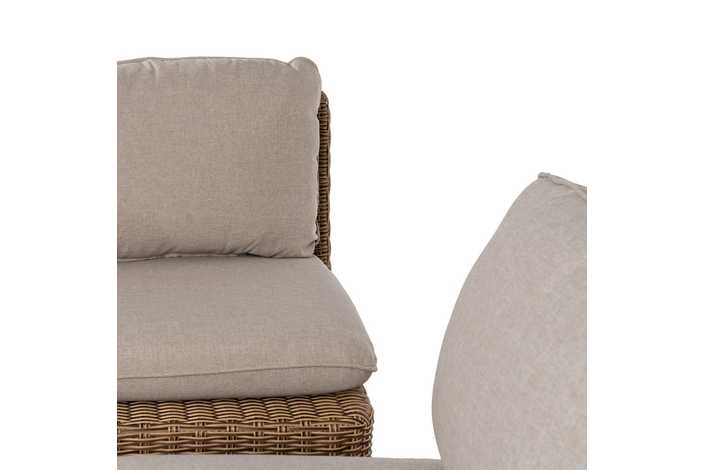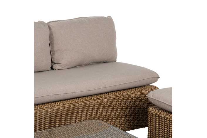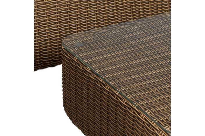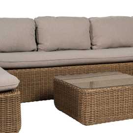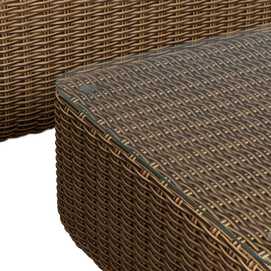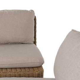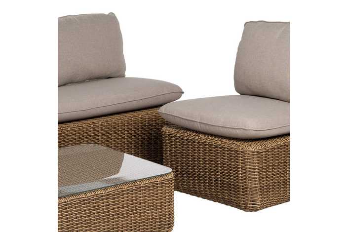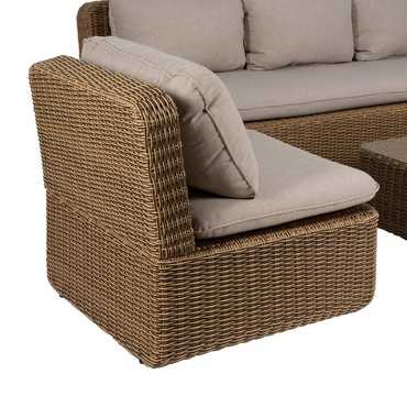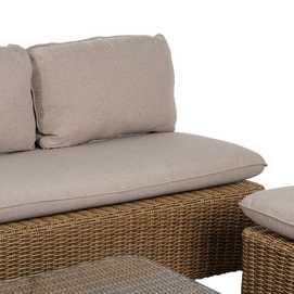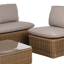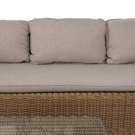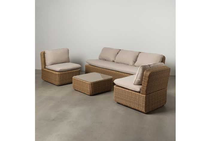 Incluye 1 sofá (215x88x79cm), 2 sillones (71x88x79cm) y 1 mesa de centro (70x70x33cm). Estructura de aluminio y ratán sintético (PE). Tablero de la mesa de cristal templado. Tejido 100% olefina. Relleno del asiento: foam densidad 25 + 300gr de tejido sintejer. Relleno del respaldo: algodón de polipropileno + 150gr de tejido sin tejer. Altura asientos: 48cm. Profundidad asientos: 47cm. Altura respaldo: 42cm. Cojines desenfundables. Cumple la normativa EN581 (uso exterior).