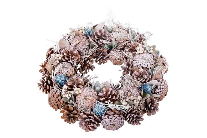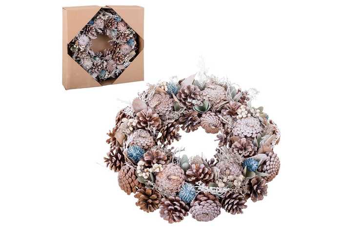 CORONA PIÑAS, FLORES Y HOJAS BLANCO-AZUL 36 X 9 X 36 CM