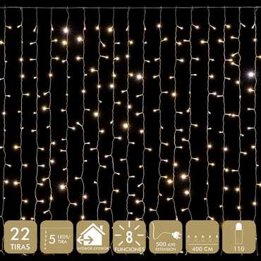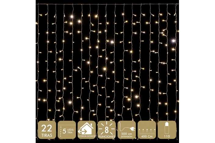 FUNCIONA CON LA RED ELÉCTRICA 20mA 3.6W. TRANSFORMADOR CON 8 FUNCIONES. IP44 (USO INTERIOR / EXTERIOR) CABLE TRANSPARARENTE DISTANCIA ENTRE BOMBILLAS: 10 CM. 22 TIRAS. DISTANCIA ENTRE TIRAS: 18 CM. 110 LEDS DE LUZ CÁLIDA. EXTENSIÓN DE CABLE: 5 METROS. PRESENTACIÓN EN CAJA DE PVC Y ETIQUETA DE COLOR.
