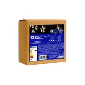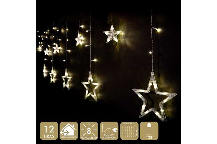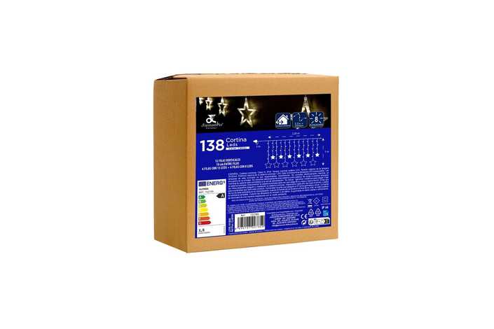 FUNCIONA CON LA RED ELÉCTRICA 20mA 1.5W. TRANSFORMADOR CON 8 FUNCIONES. IP44 (USO INTERIOR / EXTERIOR) CABLE TRANSPARARENTE 138 LEDS DE LUZ CÁLIDA EXTENSIÓN DE CABLE: 3 METROS. ESTE PRODUCTO NO TIENE LA FUNCIÓN DE TEMPORIZADOR. PRESENTACIÓN EN CAJA MARRÓN.