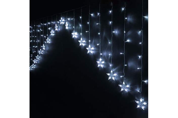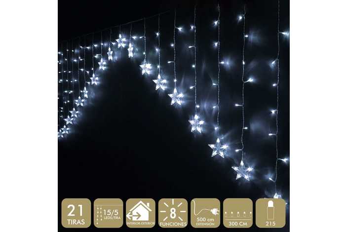 USO INTERIOR/EXTERIOR (IP44). CORTINA A LA RED ELÉCTRICA. TRANSFORMADOR 24V. 8 FUNCIONES. 21 TIRAS. DISTANCIA ENTRE FILAS: 25 CM. EXTENSIÓN CABLE DE 500 CM. LONGITUD TOTAL: 800 CM. CABLE TRANSPARENTE.