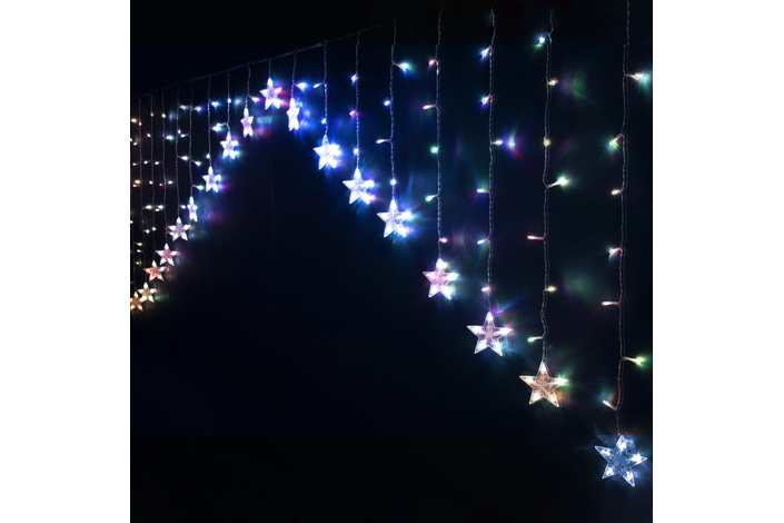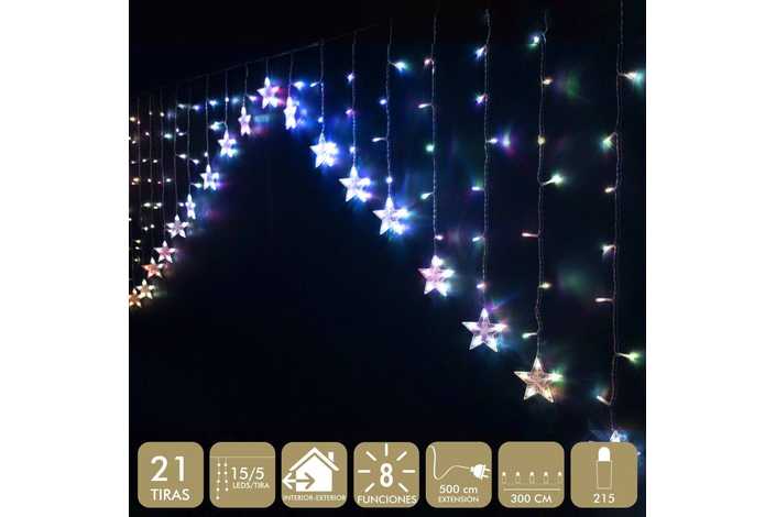 USO INTERIOR/EXTERIOR (IP44). CORTINA A LA RED ELÉCTRICA. TRANSFORMADOR 24V. 8 FUNCIONES. 21 TIRAS. DISTANCIA ENTRE FILAS: 25 CM. EXTENSIÓN CABLE DE 500 CM. LONGITUD TOTAL: 800 CM. CABLE TRANSPARENTE.