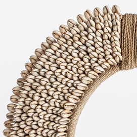 Escultura collar conchas, en color marrón, de estilo étnico. Fabricado en resina, combinado con concha y hierro. Fibra natural.