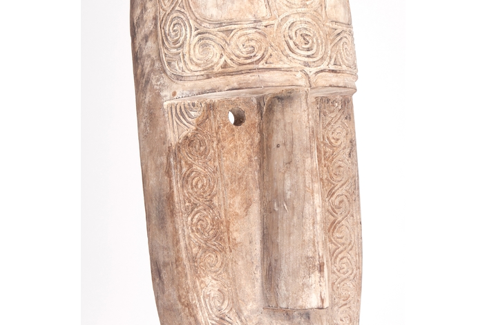 Escultura máscara, en color marrón envejecido, de estilo étnico. Fabricado en madera tropical.