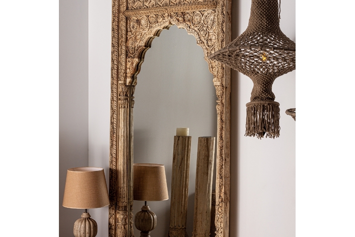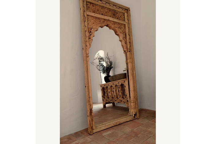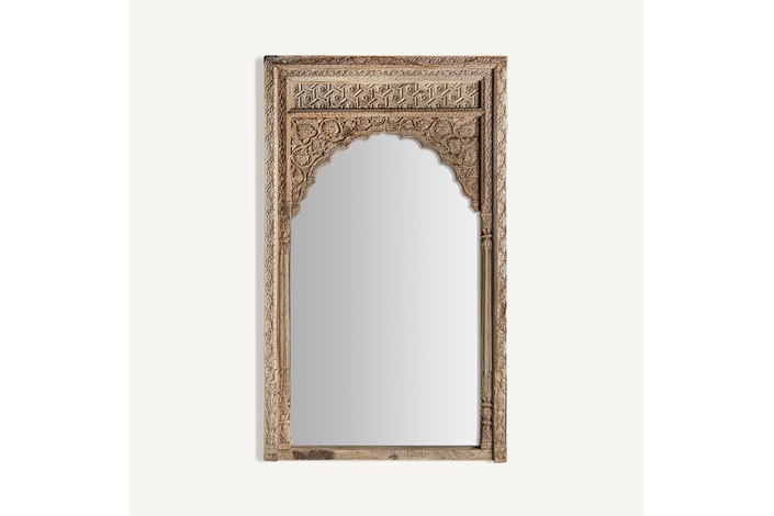 Espejo argeen, en color marrón envejecido, de estilo étnico. Fabricado en madera de teka, combinado con espejo.
