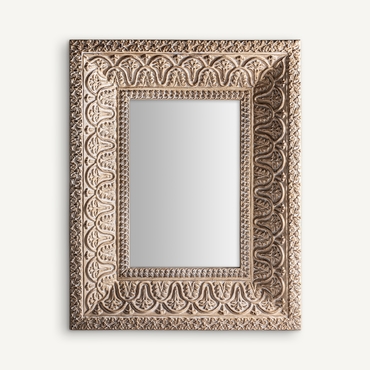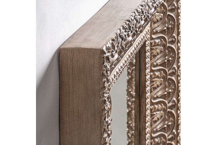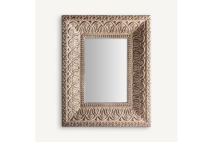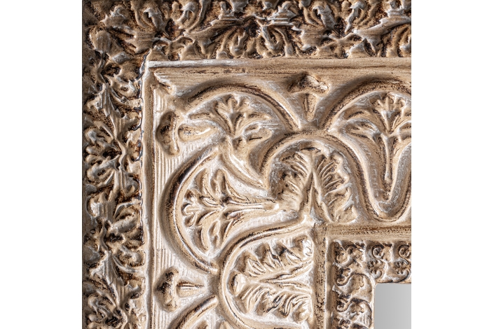 Espejo Barveire de estilo oriental, fabricado en resina en color beige con acabado envejecido, combinado con espejo.