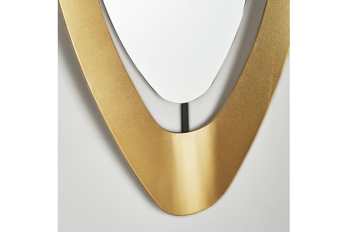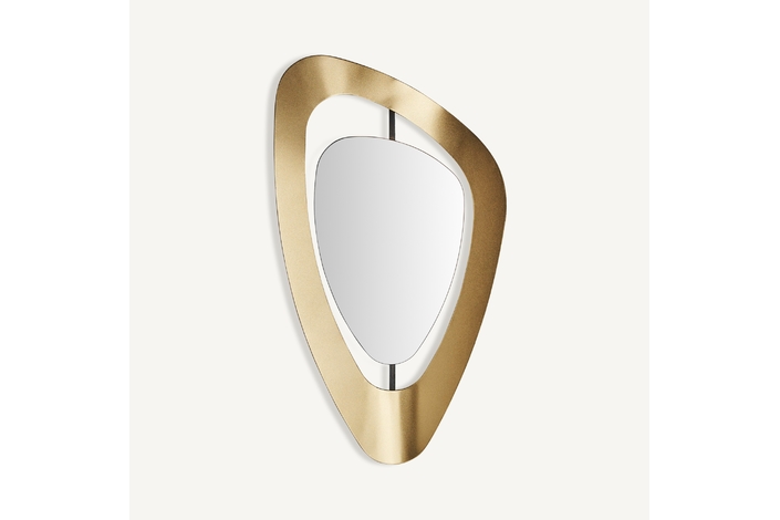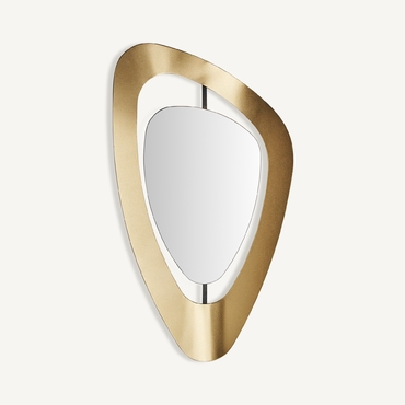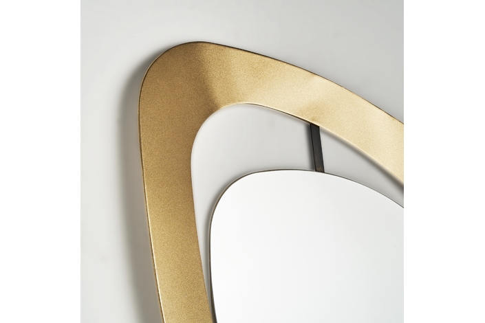 Espejo berila, en color oro, de estilo art deco. Fabricado en cristal, combinado con hierro y madera dm.