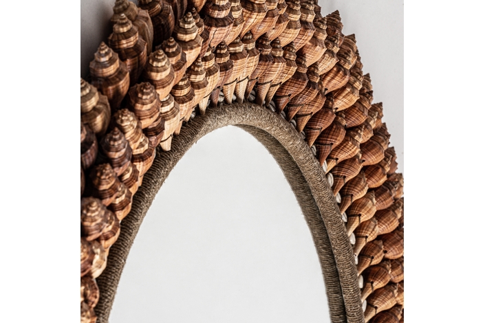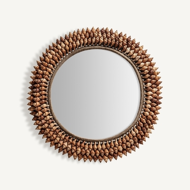 Espejo redondo caracolas, en color tonos en marrón, de estilo étnico. Fabricado en espejo, combinado con concha y madera dm.