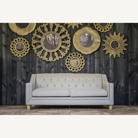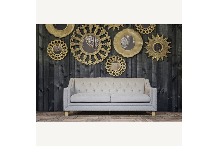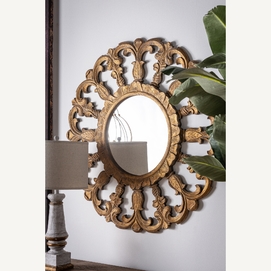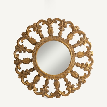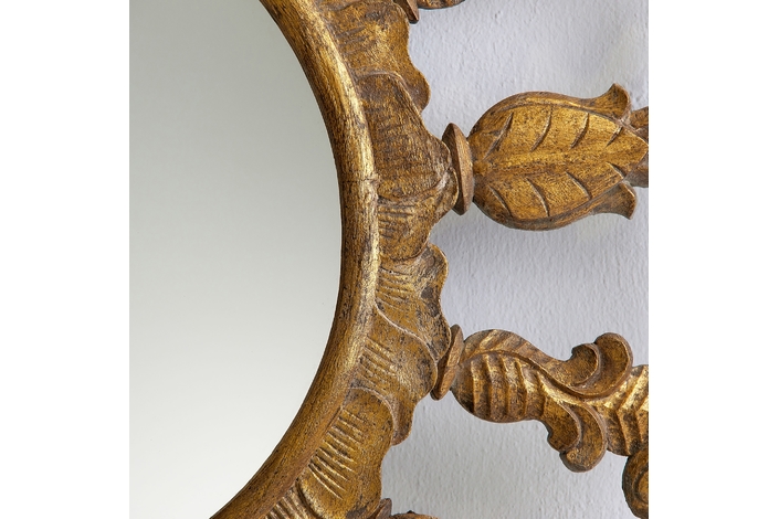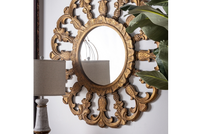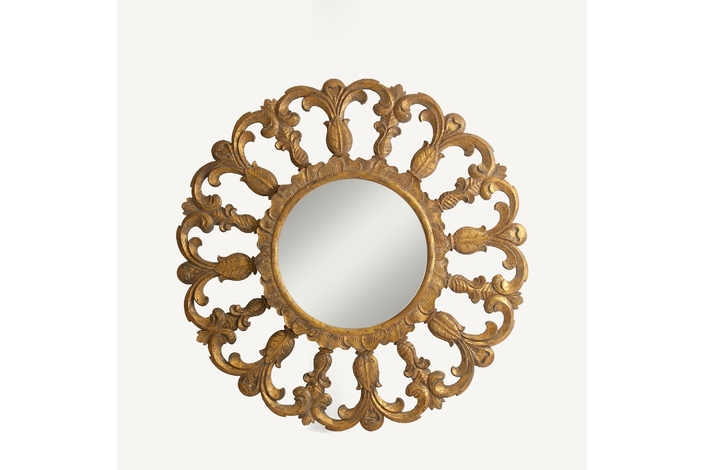 Espejo redondo charpey, en color oro viejo, de estilo art deco. Fabricado en madera tropical, combinado con espejo.