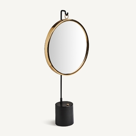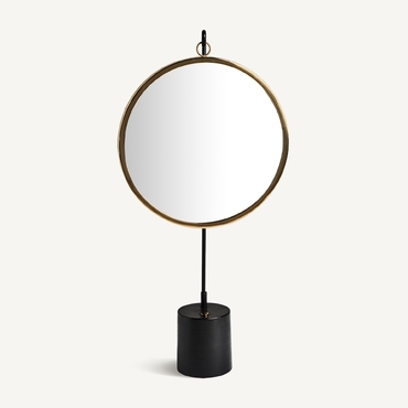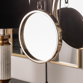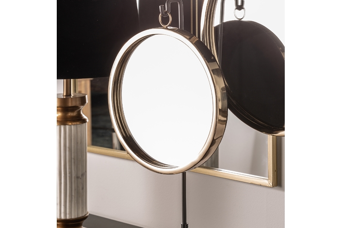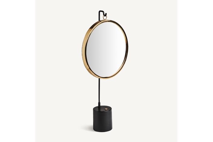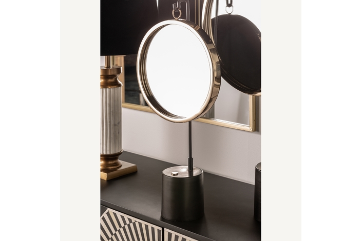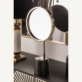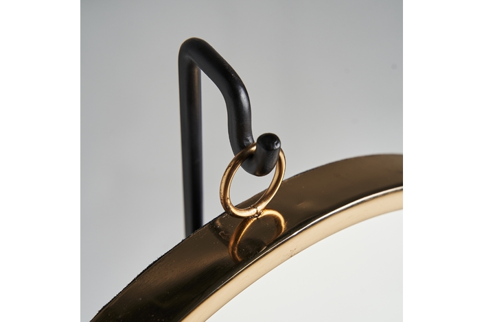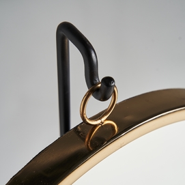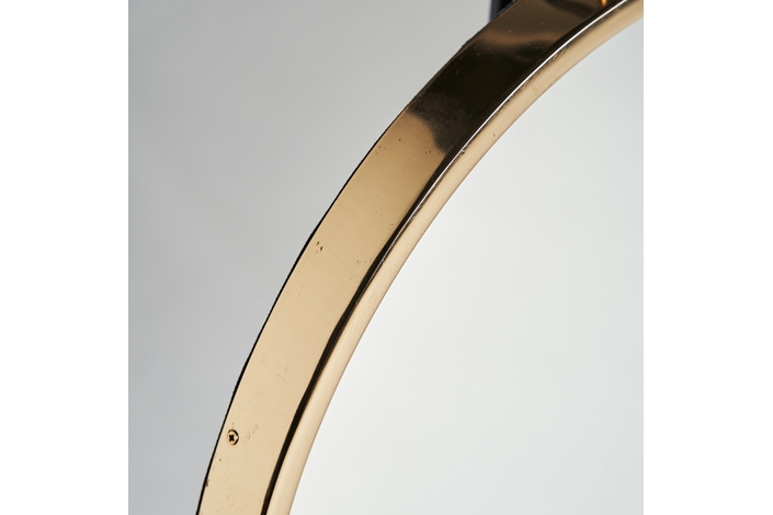 Espejo frielk, en color negro/oro, de estilo art deco. Fabricado en latón, combinado con espejo.