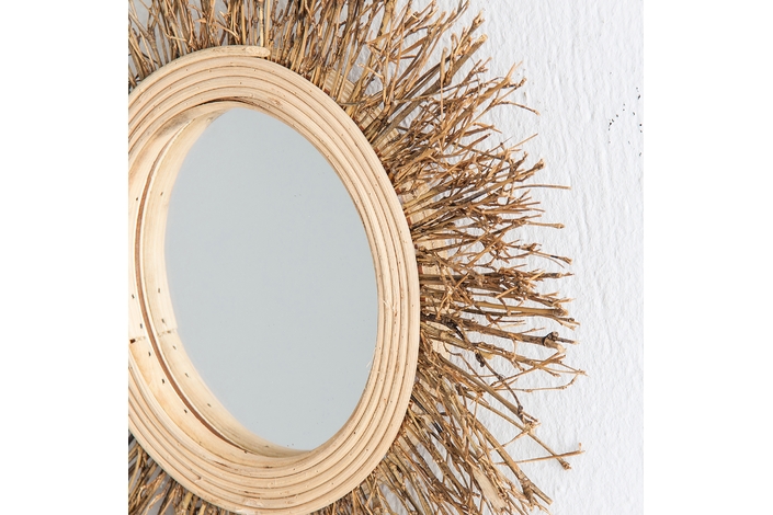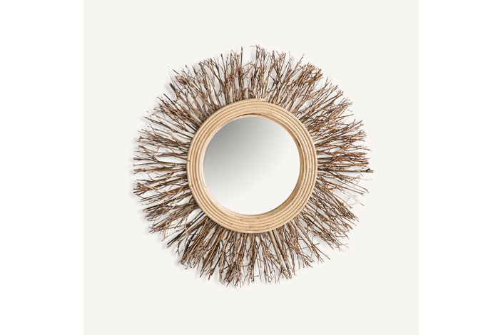 Espejo redondo kail, en color marrón, de estilo étnico. Fabricado en bambú, combinado con espejo y madera contrachapada.
