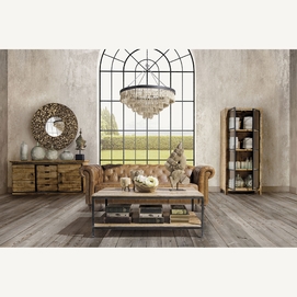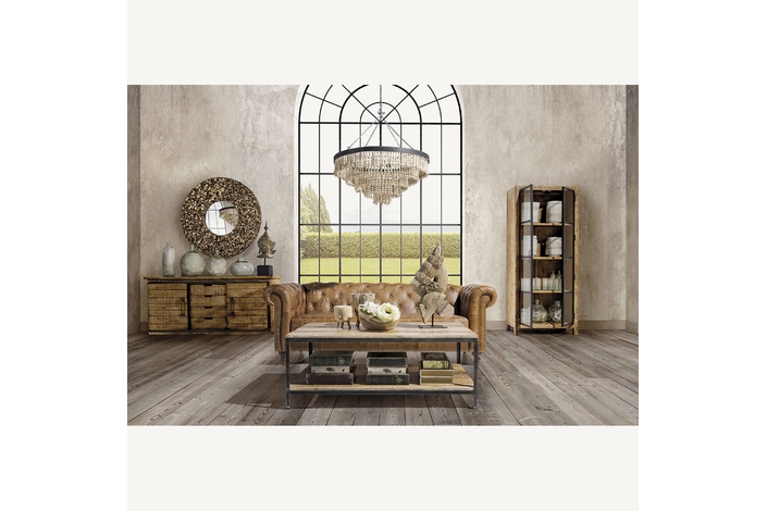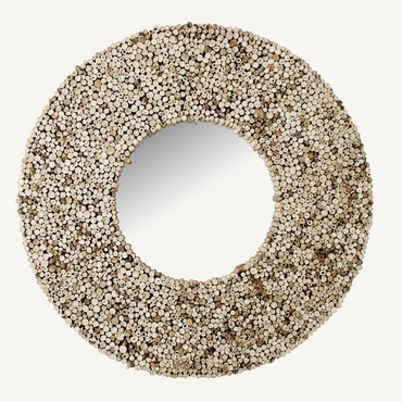 Espejo redondo maun, en color marrón, de estilo étnico. Fabricado en madera de teka, combinado con espejo.