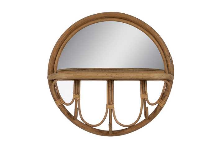 Material: ratán. Medida interior espejo: 35,5x17cm. Balda: 41x10cm. Incluye sistema de anclaje para su correcta colocación.