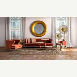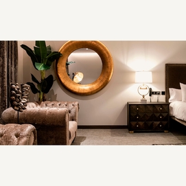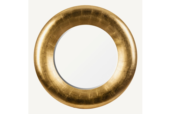 Espejo redondo regen, en color oro, de estilo art deco. Fabricado en resina, combinado con espejo.