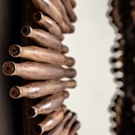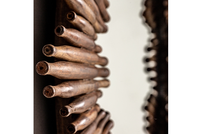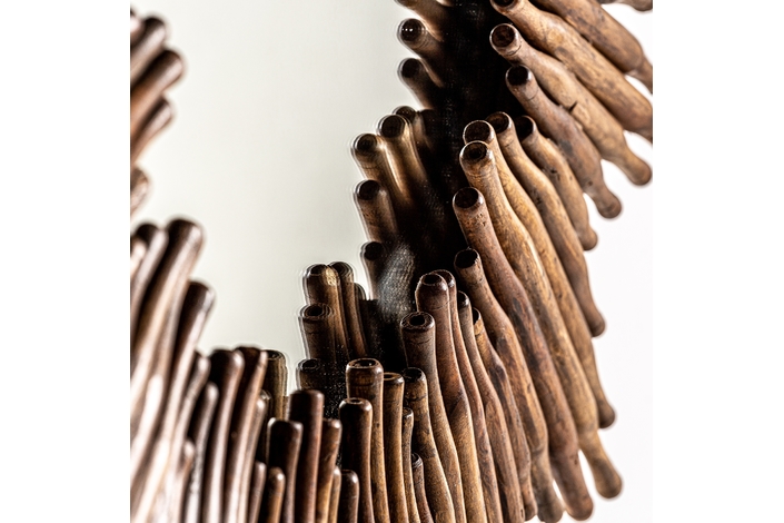 Espejo rieden, en color marrón, de estilo colonial. Fabricado en madera de mango reciclada, combinado con espejo.