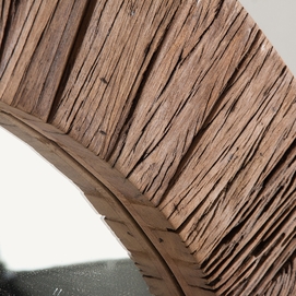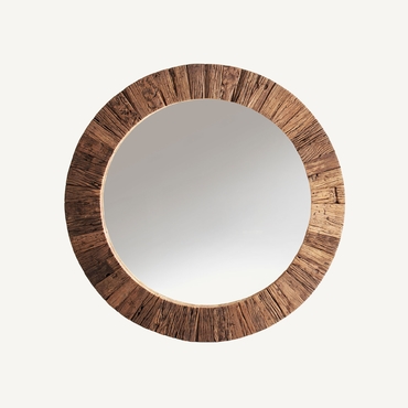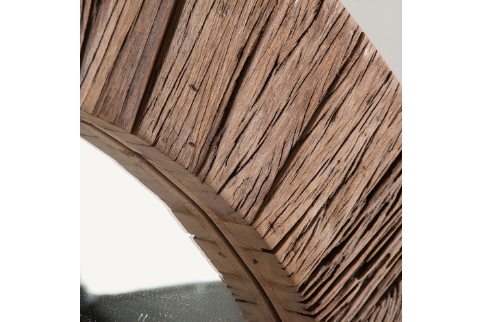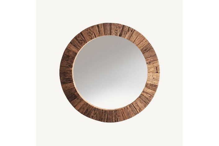 Espejo redondo tarakan, en color natural envejecido, de estilo étnico. Fabricado en maderade teka reciclada, combinado con espejo.