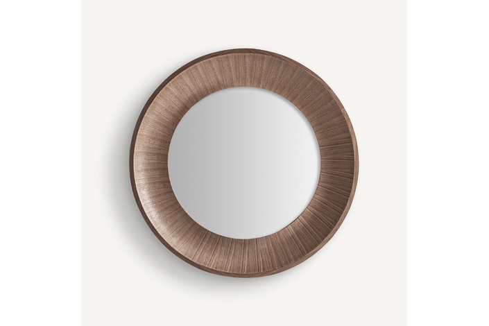 Espejo Zermatt de estilo art deco, fabricado en espejo, combinado con madera nogal en color marrón claro y madera dm en color marrón.