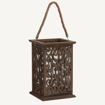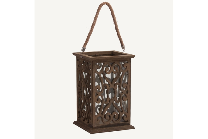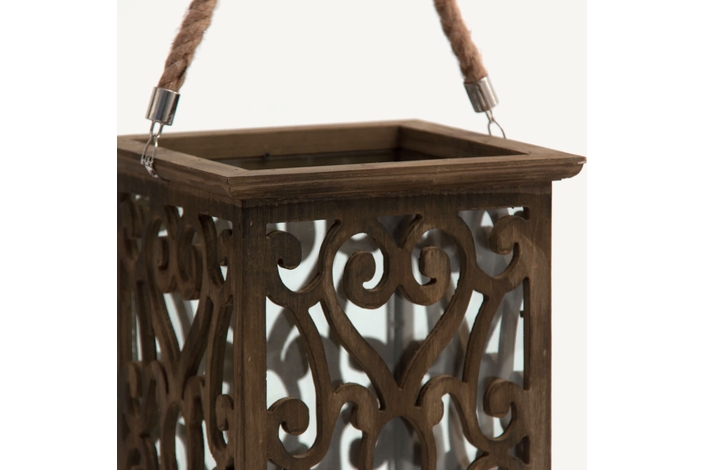 Farol, en color chocolate, de estilo provenzal. Fabricado en madera de abeto, combinado con vidrio y cuerda.