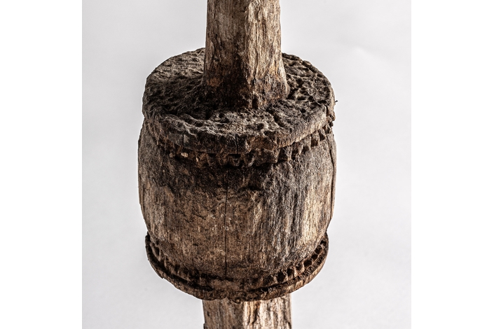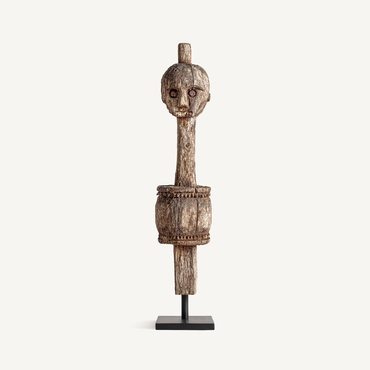 Figura leye, de estilo étnico. Fabricado en madera de mango, en color marrón envejecido, combinado con hierro, en color negro.