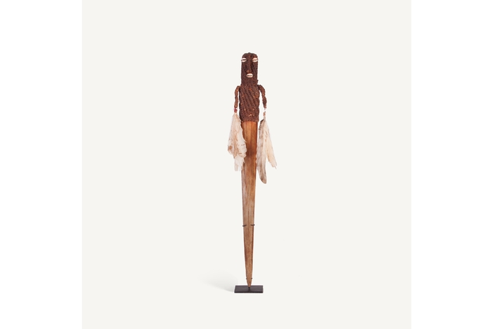 Figura grande máscara, en color marrón/beige envejecido, de estilo étnico. Fabricado en hierro, combinado con resina.