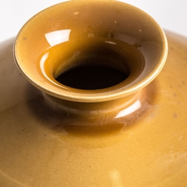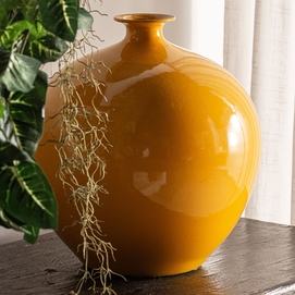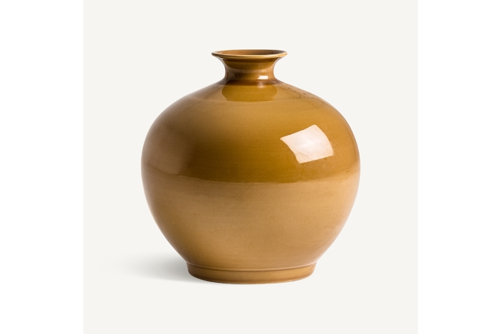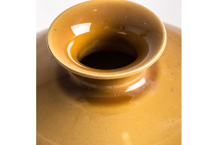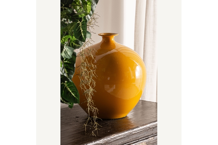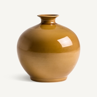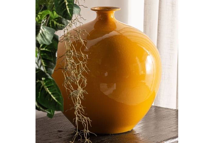 Jarrón mostaza, en color mostaza, de estilo colonial. Fabricado en cerámica.