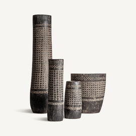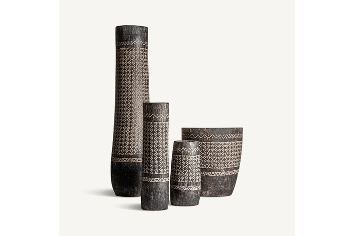 El jarrón Nantua, en madera de palma marrón tallada, destaca por su acabado artesanal y formas envolventes. Una pieza de VICAL con presencia y estilo.