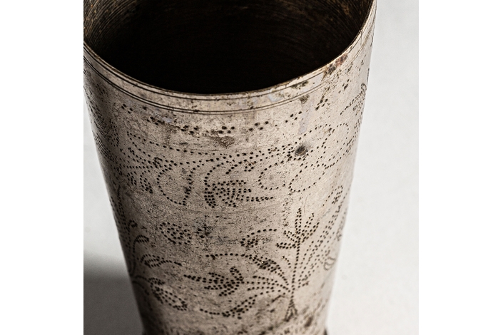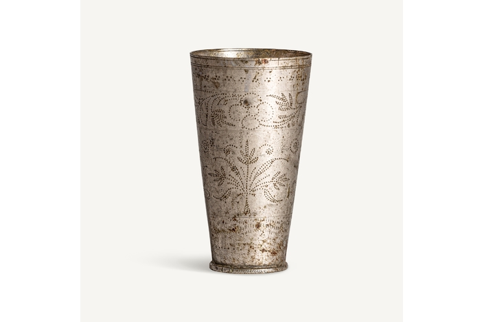 Jarrón ren, en color plata viejo, de estilo oriental. Fabricado en latón.