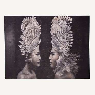 Lienzo rectangular caras balinesas, en color negro artesanal, de estilo oriental. Fabricado en loneta, combinado con madera de pino.