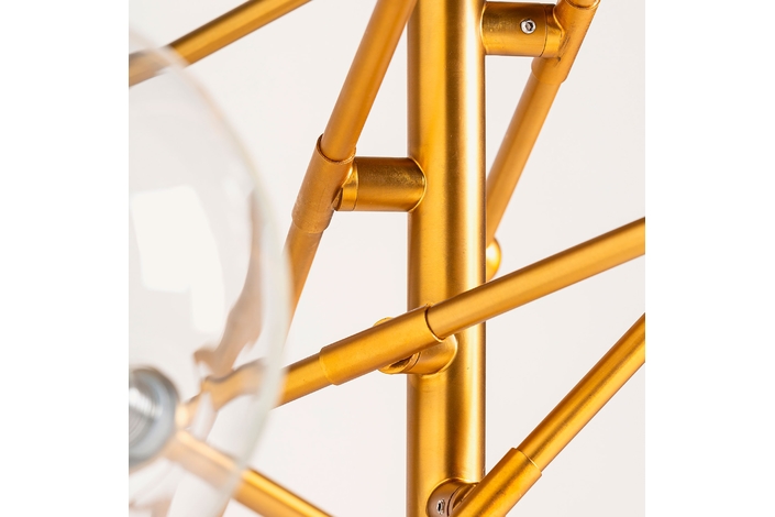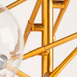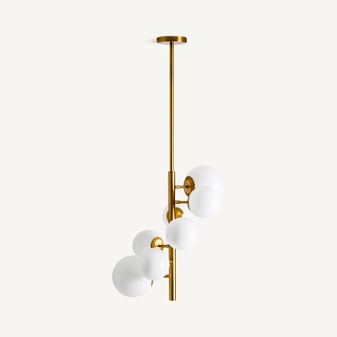 Lámpara de techo que sigue la tendencia de las lámparas bola combinando hierro dorado con vidrio de color blanco. Una pieza de estructura metálica ligera que confiere un carácter delicado y único a la decoración del espacio.