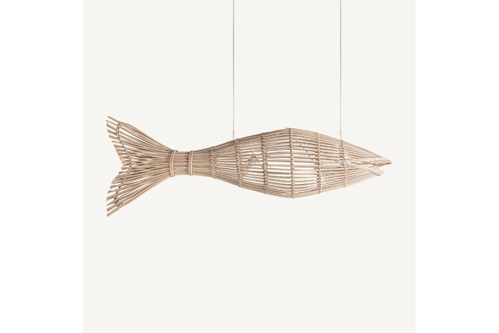 Lámpara de colgar pez de estilo boho, fabricado en ratán en color marrón.