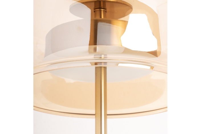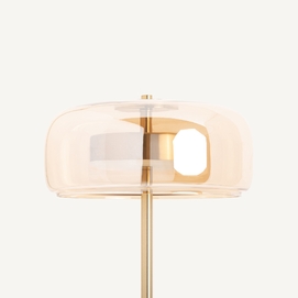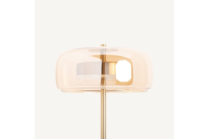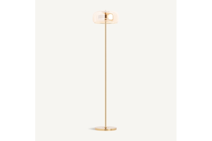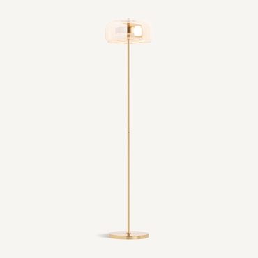 Lámpara de pie leslia, en color oro, de estilo art deco. Fabricado en hierro, combinado con acrílico y cristal.
