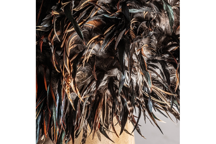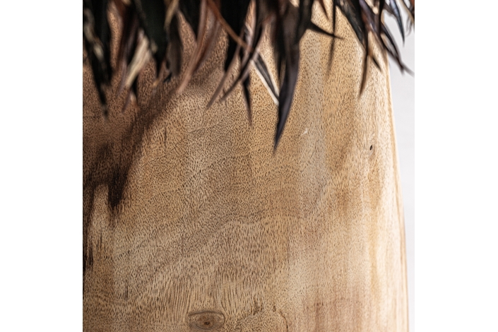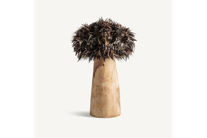 Lámpara de sobremesa ghedas, en color marrón envejecido, de estilo étnico. Fabricado en madera de teka, combinado con plumas. . Producto elevable.
