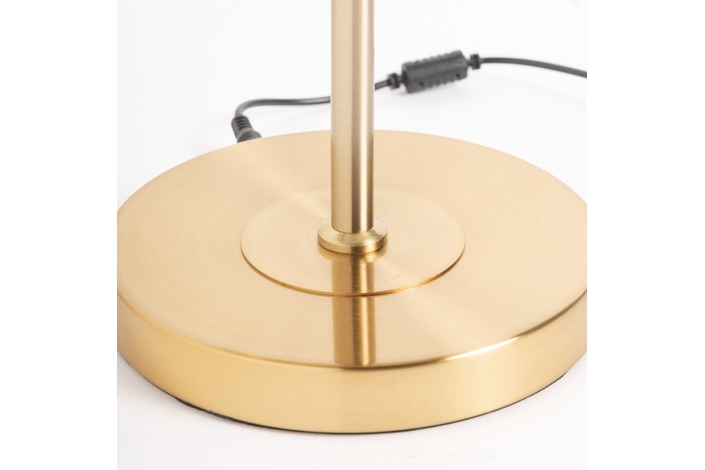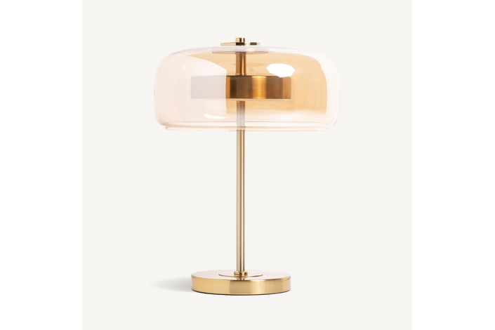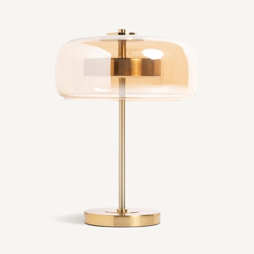 Lámpara de sobremesa leslia, en color oro, de estilo art deco. Fabricado en hierro, combinado con acrílico y cristal.