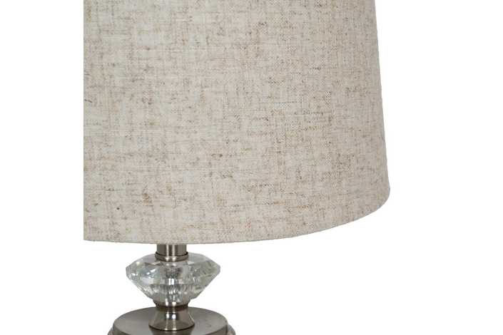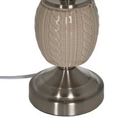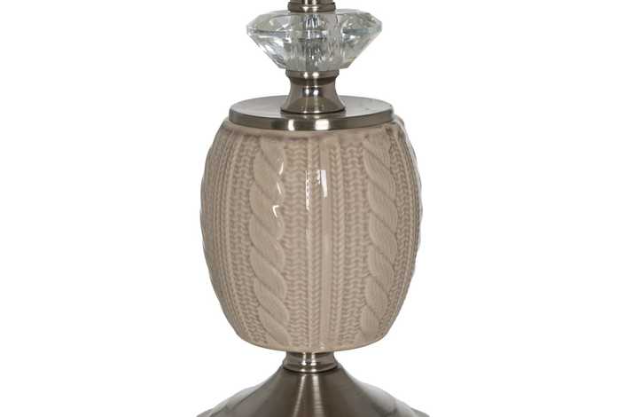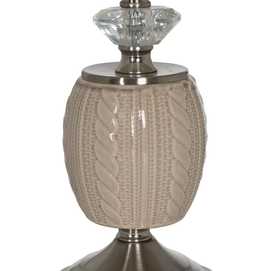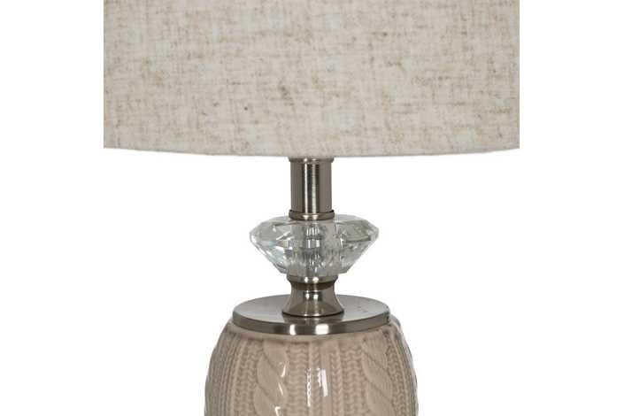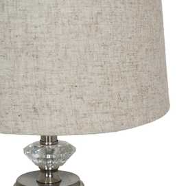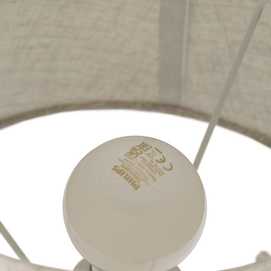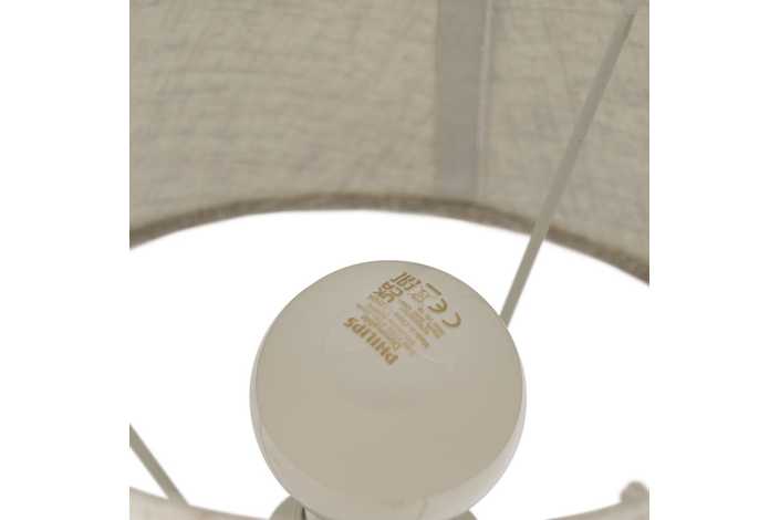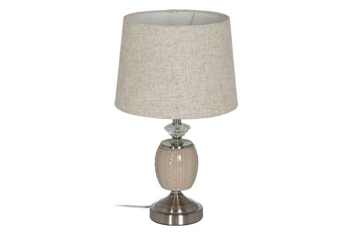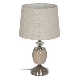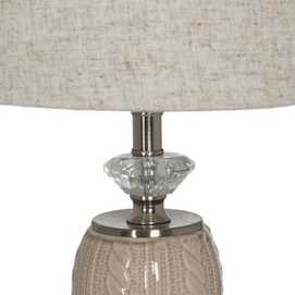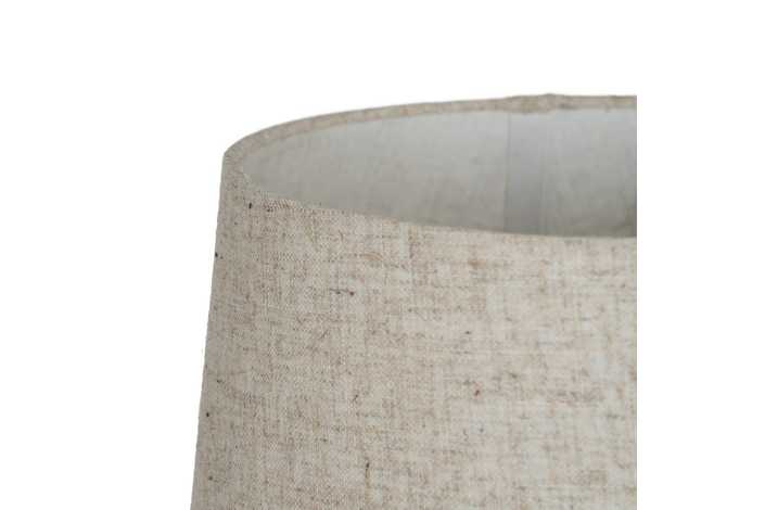 Material base: cerámica, cristal, metal. Material tulipa: 80% lino, 20% poliéster. Medida tulipa: 23x28x20cm. Medida base. 12x12x25cm. Voltaje: 220V. Casquillo: E27. Bombilla: 1*10W máx. led (no incluida). Longitud del cable: 180cm.